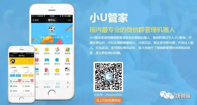 这是一款社群管理工具,前身是公众号“一起社群”,现在已经改版升级,推出“小u管家”这个这个微信群管理服务的智能机器人。