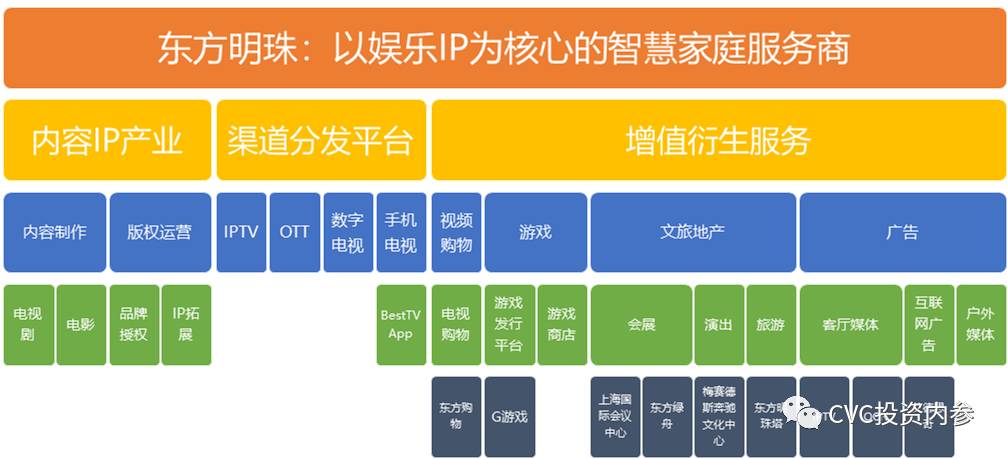 百视通是在广电系统下的创新新媒体业务,在智能电视到来之前就提早布局互联网电视,拥有4张全国性IPTV牌照之一,成为全球IPTV领头羊;现整合东方传媒集团为东方明珠,大力拓展娱乐内容,覆盖游戏、影视,进而以电视端切入智慧家庭、智慧社区。