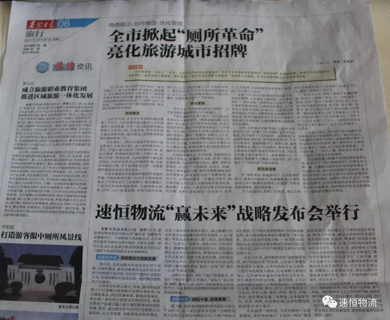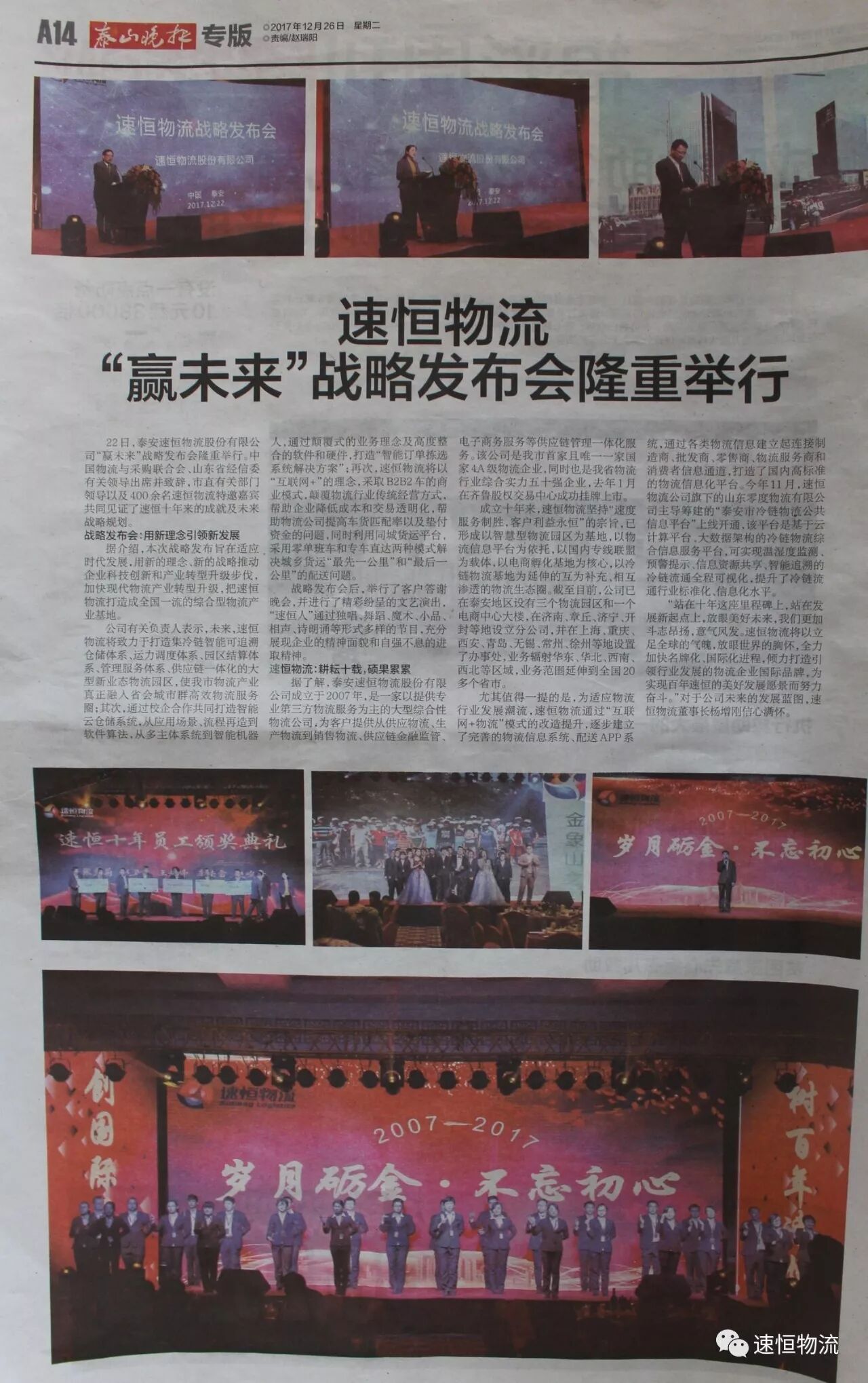 12月22日,速恒物流“赢未来”战略发布会在蓝海御华大酒店隆重举行。会议召开以来得到了各大媒体、新闻机构的广泛关注及鼎力支持,并在山东新闻网进行了现场网上直播,泰山区广播电视台黄金时间进行了新闻报道,泰山晚报12月26日A14版专版报道,泰安日报12月27日06版进行了大篇幅报道。