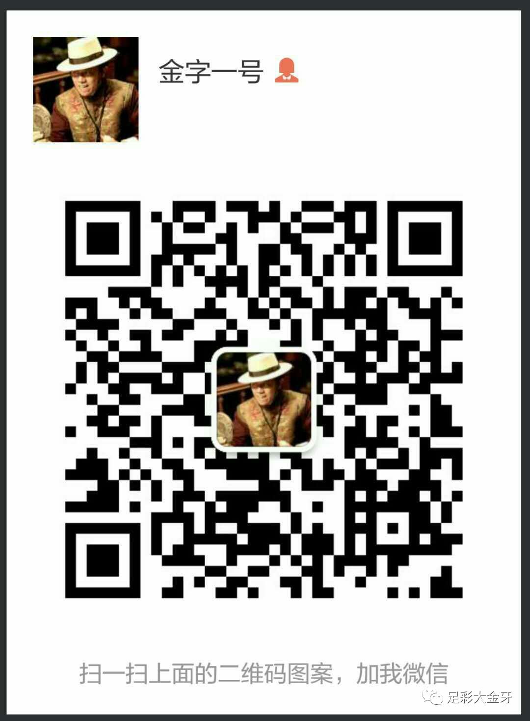 【强烈推荐】一个命中率极高极稳定的朋友,专注认真有态度的微信公众号【足彩大金牙】,推荐全公开全免费。曾任职于国内门户网站体育专栏,负责编辑和收集比赛资讯和情报,被业界称为足球百科全书,完成每期比赛分析和推荐,曾开创28连红记录,单关命中率长期高达70%以上,目前王牌重心推荐命中率高达80%,赶紧关注,资深媒体人必定让你收获无数,提高自己的独立思维,扫描下方二维码识别关注即可!本月公推目前15中12,公推七连红,再不关注就晚了。