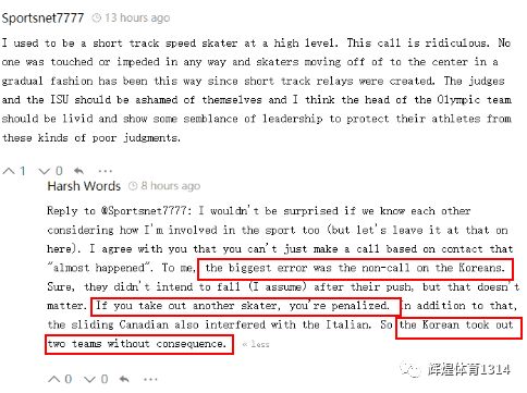 也有此前从事短道速滑项目的网友留言:“我之前是一名资深的短道速滑运动员,加拿大被判犯规真的是荒谬至极!裁判和国际滑联应该感到羞耻!”