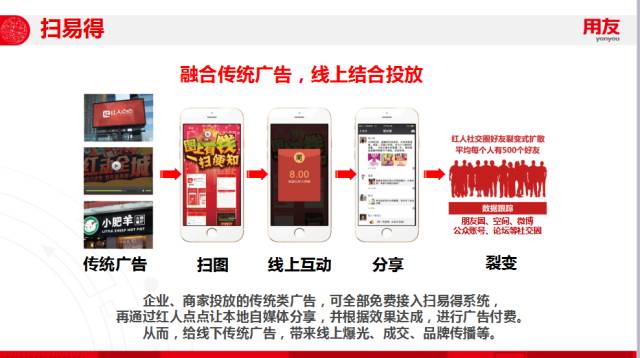 应用场景:与传统广告存在相结合,可以实际扫实物或实际场景,与用户达成互动,于商家而言,结合扫易得解决广告公司互动问题和数据反馈,突破地域性限制。