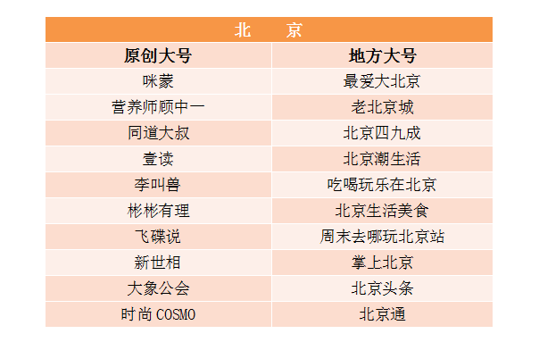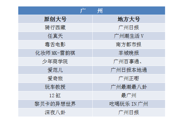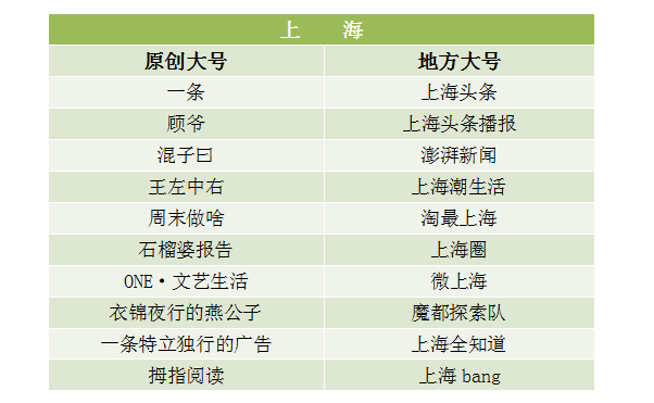 数据组同事综合了不同账号在微播易平台上的客户搜索量、订单量、接单量、SNBT指数等数据,给出了上海、北京、深圳、广州这4个最热搜城市中,搜索量排名前10的原创大号和地方大号推荐榜单: