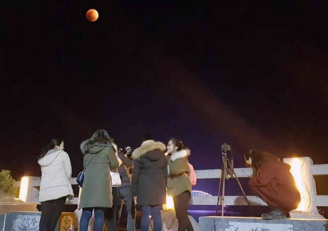 “快看,是红月亮。”现场观众兴奋地用手机、相机记录着天象。