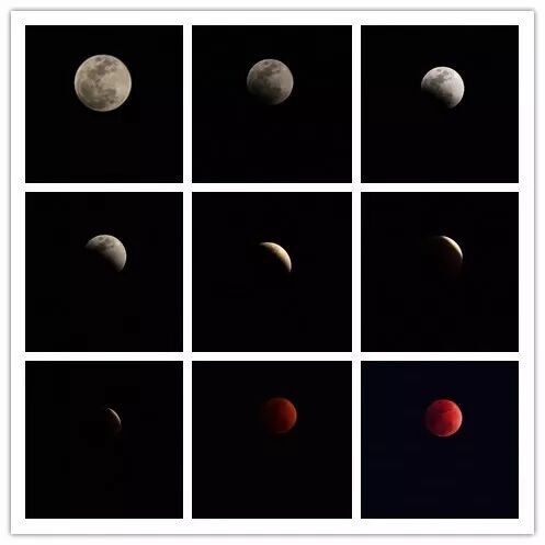 约19时50分,月亮左下方已逐渐模糊,渐渐“躲入”影子之中。8点多,百年一遇的“超级蓝血月全食”如约而至。从20时51分开始,月亮完全进入地球的本影。21点多,月亮洁白的底色逐渐消逝,呈古铜色,好似天空闭上了眼睛。