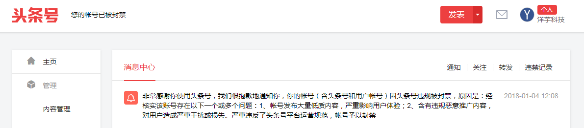 看看今日头条给我的封禁原因: