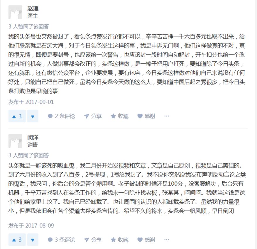 上一张知乎上的截图,关于头条号封禁的问题,可以去各个搜索引擎搜索或者去知乎搜索关键词,会有一堆出来的。
