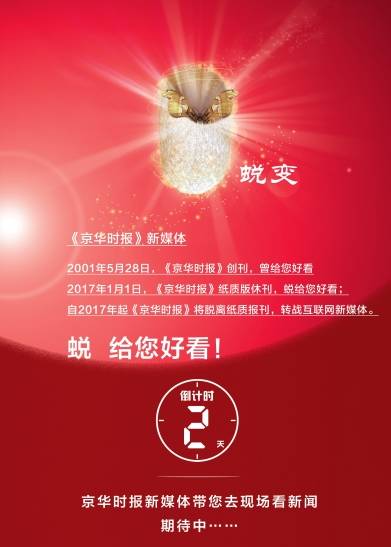 12月29日消息,今日《京华时报》在头版公告,《京华时报》(纸质版)2017年1月1日休刊,同时,保留和发展《京华时报》新媒体业务。其一份宣传海报中也提到,自2017年起《京华时报》将脱离纸质报刊,转战互联网新媒体。