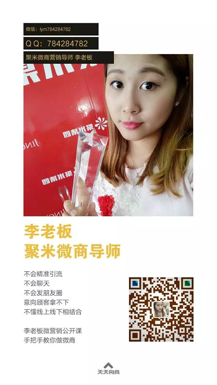 那么你只需要学会我教你们的这些方法,我相信 你想把微商做起 还是很容易的。今天就分享到这里 下次给你们高级微商如何打造!我是聚米微商大学金牌导师玉梅,微信784284782 有不懂的可以问我 或者关注我的荔枝FM1869082 也可以听我的分享哦。