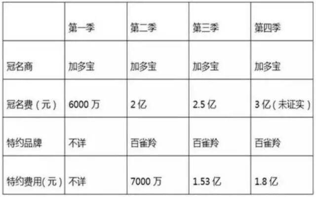 火热的乐综艺节目依然是广告商投放的重点,这个无论是在电视还是网络都很明显。然而好的综艺就几个,广告商却有几百个,面对狼多肉少的情况,价位自然也就不在话下,连续4年冠名《中国好声音》的加多宝也抵不住飙升的冠名费而被法兰琳卡4亿价格所替代,而《爸爸去哪儿》《奔跑吧兄弟》等热门综艺每年的冠名商也是换了一波又一波。其实高居不下的冠名费用自然有其存在的道理,但是这样一些重量级的招标活动不是任意一个品牌能吃下去的,因此有钱人玩的游戏依然按照有钱人的套路走。