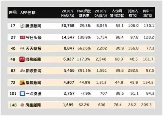 根据艾媒咨询(iiMedia Research)今年8月发布的《2016上半年中国手机新闻客户端市场研究报告》数据显示,2016上半年中国新闻客户端活跃用户分布排行中,腾讯新闻、今日头条占据前二,一点资讯为5.7%,排在第八位。在市场占有率上,腾讯新闻和今日头条为第一集团,一点资讯以及门户新闻客户端属于第二阵营。大数据服务商QuestMobile最近发布9月APP TOP 2000榜单也显示,一点资讯排名第101位,与腾讯新闻和今日头条相距甚远,也落后于天天快报、网易、新浪、搜狐新闻。