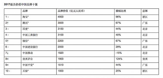 5、【2017年胡润品牌榜公布,淘宝、腾讯、百度位列前三】
