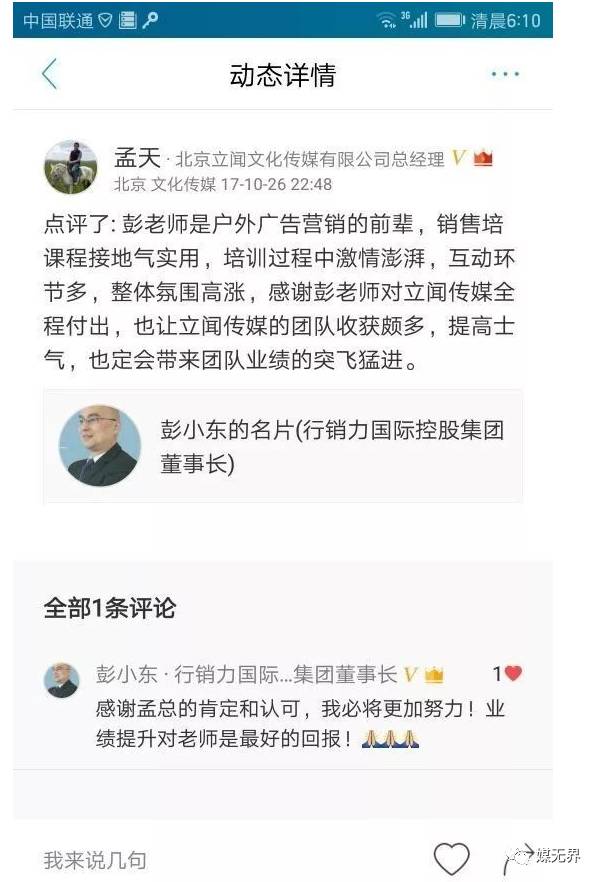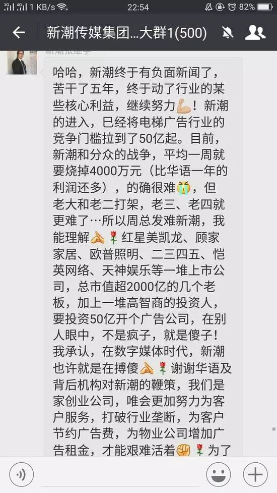 文章一经发出数小时后,新潮传媒董事长就立刻做出激烈反应在自家群里贴出一段文章要求新潮员工必须全部转发朋友圈。