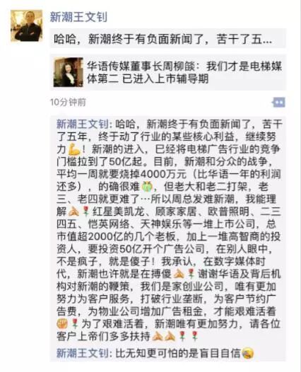 无独有偶近日一篇文章《华语传媒董事长周柳燄:我们才是电梯媒体第二 已进入上市辅导期》在投资界引起巨大反响。华语传媒董事长周柳燄和新潮传媒董事长张继学隔空交火,一时间引发众人围观,以下是该文的摘录: