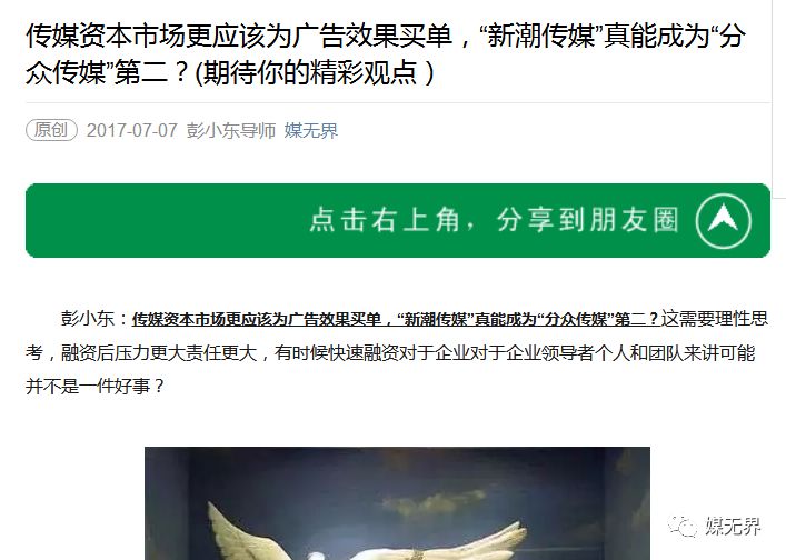 这我们姑且信之,老大有了,可是老二是谁?江湖上就好像有点乱了,江湖事江湖了,彭小东导师早在2017年07月07日就在媒无界微信公众号上首发《传媒资本市场更应该为广告效果买单,“新潮传媒”真能成为“分众传媒”第二?(期待你的精彩观点)》